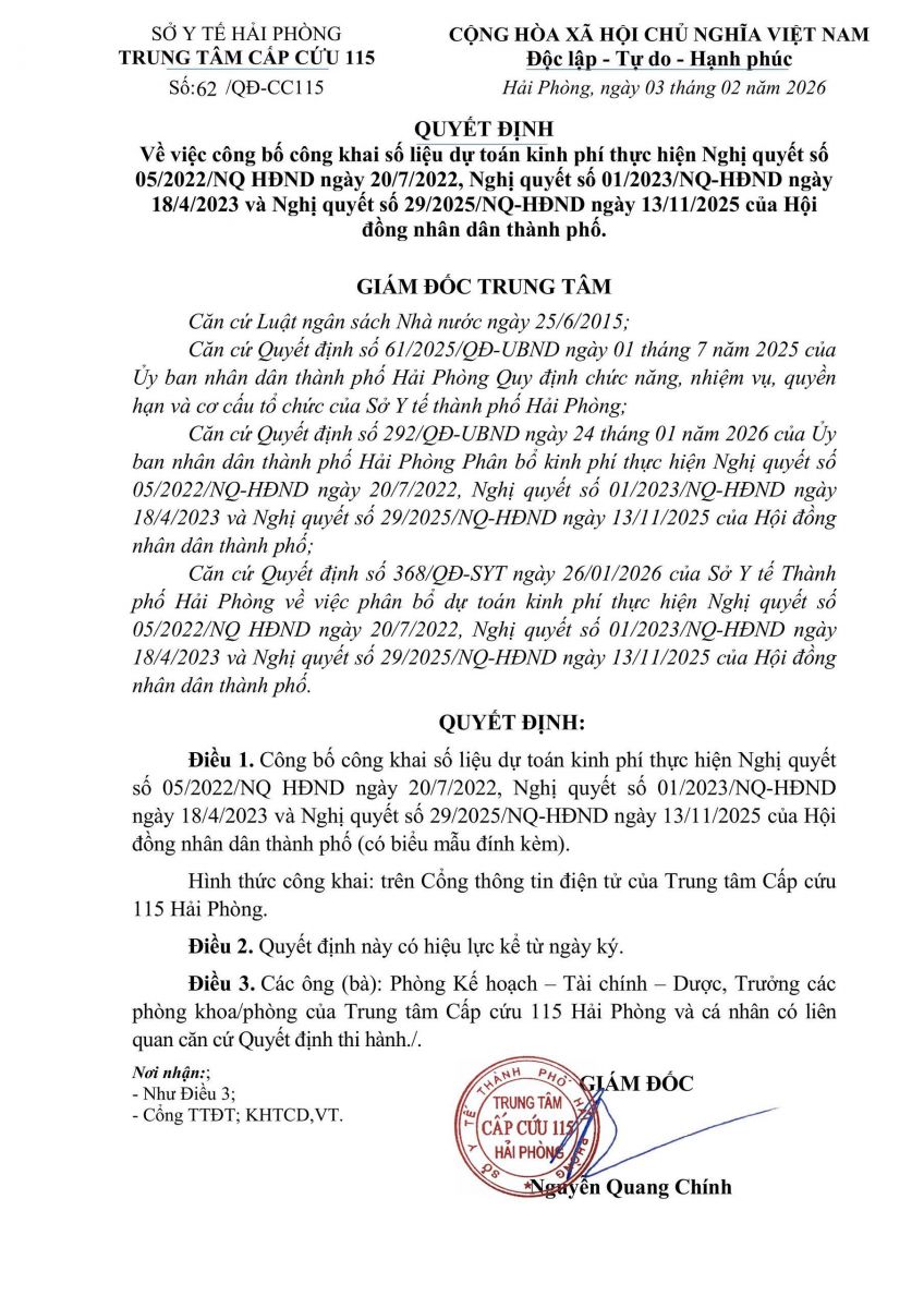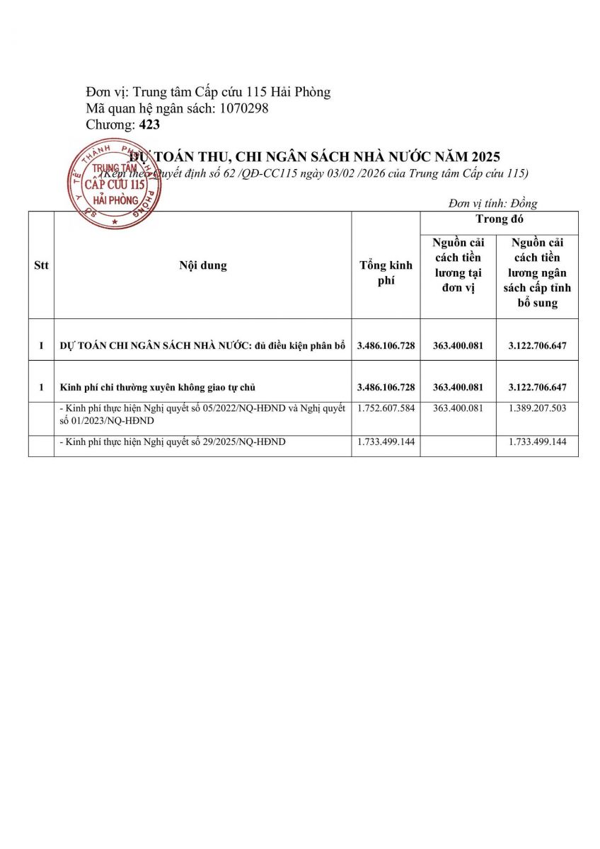 Công khai dự toán ngân sách cấp Trung tâm Cấp cứu 115 Hải Phòng năm 2026